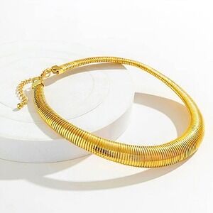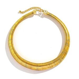 Chunky gold stainless steel exaggerated choker necklace measures adjustable 18”-21”.