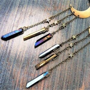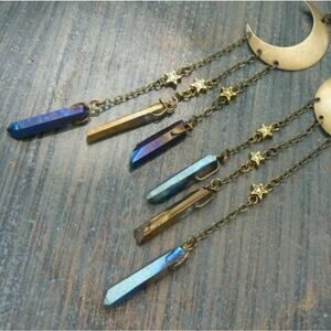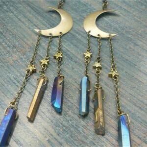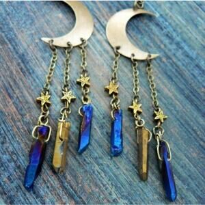 Natural crystals vary in shape and size. Surgical stainless steel hooks. Distressed metal moon. Dangling crystals.