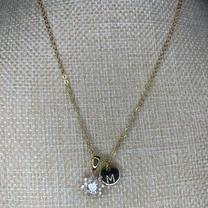 A small, round gold-tone disc charm engraved with the initial 'M'.