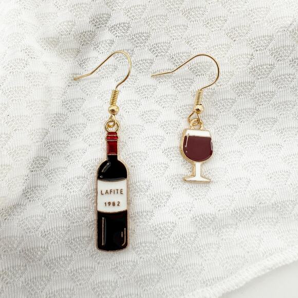 Gold Dangle Drop Earrings with Red Wine Bottle and Red Wine Glass Charms