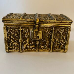 Elegant gold decorative box with intricate designs. Perfect for adding a touch of luxury to any room.