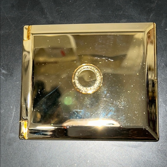 This exquisite gold-tone compact mirror features a polished, mirror-like finish that adds a touch of elegance. Its unique circular detail and framed edges make it a standout piece.