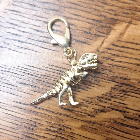 Gold dinosaur charm with a lobster clasp. Perfect for adding a unique touch to your accessories. Can be on your handbag, jewelry, keychain, and backpack. Hangs 2". Very similar to coach Rex the dinosaur.
