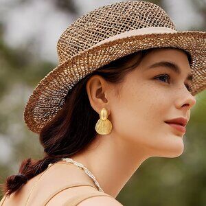 Product details Material Brass Metal type Brass Back Finding Push Back Earring design Drop Gem type No Gemstone About this item Gold plated: 14k gold plated; brushed gold shine and luxurious; budget friendly Size Length about 1.77 inch, width about 0.86 inch, weight about 0.27oz Gold dangle earrings: fan shell shape design; minimalist chunky statement earrings To love one: These earrings are presented in a nice box, a fantastic way to express your love Any-Occasion Accessory This earring is suitable for Weddings, Proms, Bridesmaids, Parties, Proms, Pageants, Homecoming, Galas, Formal Affairs, Holiday, Birthday, Valentine's Day, Mother's Day or any other special occasion See more About this item