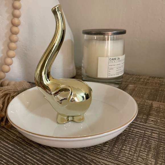 Elegant gold elephant ring holder. Perfect for organizing jewelry. Please see in last picture for few imperfections on back of elephant. Preloved💗
