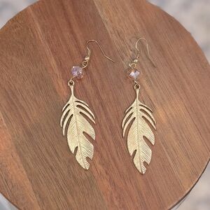 Gold Feather Drop Earrings with Pink Bead – Boho Chic Dangle Jewelry
