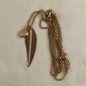 This is a gold colored necklace with two pendants. The chain is 28-32 inches long with the extender. One pendent is a gold plated feather that is 1.75 inches long and 0.5 inches wide. The other pendant is light pink circle and is 0.5 inches long and 3/8 inches wide.