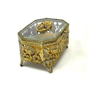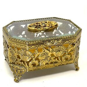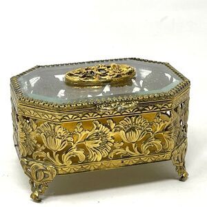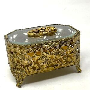 Gold Filigree Jewelry Casket Ormolu Floral Large Footed Box Yellow Velvet Matson