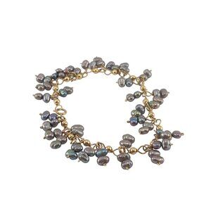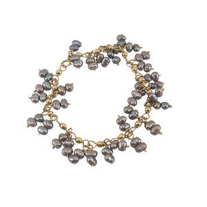 This stunning bracelet features a delicate intertwining of gold links adorned with lustrous gray freshwater pearls, evoking a sense of timeless elegance and sophistication. Each pearl is uniquely shaped, contributing to the bracelet's charm and individuality. Versatile enough to complement both casual and formal attire, this piece will undoubtedly add a touch of class to any jewelry collection.