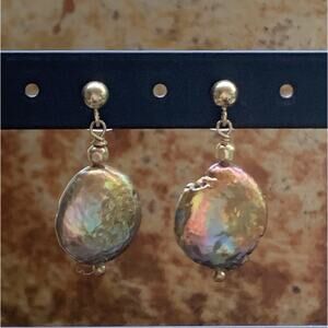 This Gold Filled Peacock Coin Pearls Necklace and Earring Statement Set features a unique combination of multicolor peacock pearls with small gold pearls and set in 14/20 gold filled metal findings. The set includes a necklace and earrings, making it a perfect gift for special occasions such as engagements, anniversaries, birthdays, or even Christmas. The vintage-inspired design with a round shape and cultured pearl creation adds a touch of elegance to any outfit, making it a beautiful and timeless addition to any jewelry collection. Marked 14/20GF.