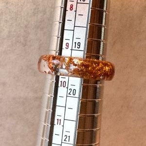 EUC. This ring is made of clear acrylic with encased golden flecks. The flecks are distributed randomly so some parts of the ring are completely clear. The size is approx. 9 1/2, and it is not adjustable. No flaws noted.