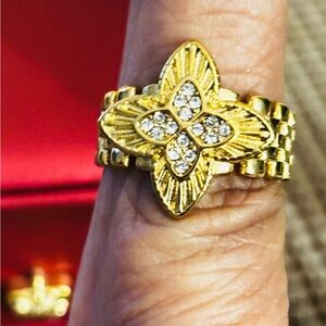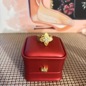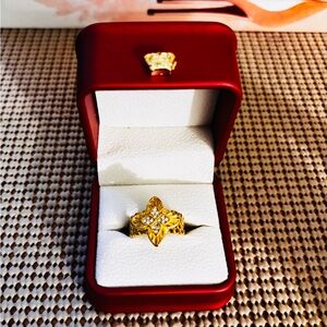 This exquisite gold ring features a floral design with sparkling diamond accents, perfect for adding elegance to any outfit.