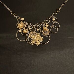 Elevate your look with this bold statement necklace featuring intricate gold floral designs and delicate pearl accents. The layered circle motif adds dimension, while the adjustable chain ensures a comfortable fit. Perfect for weddings, parties, or adding a chic vintage-inspired touch to your everyday outfit.