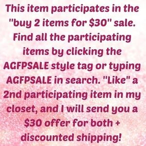 💖 BUNDLE THIS ITEM WITH ANOTHER 2/$30 ITEM IN MY CLOSET, AND I WILL SEND YOU A $30 OFFER ON BOTH! There are hundreds of participating items to choose from. To find these items, type AGFPSALE in the search bar on Poshmark or click the AGFPSALE style tag on this listing!