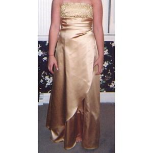 Absolutely stunning gold formal gown. I wore this just once and had it dry cleaned immediately after. There is absolutely no damage or wear to this gown. Features a textured top, long flowing bottom with lining and a front overlay, and a corset style lace up back. The detail in the top is amazing! Please ask if you'd like to see more pictures. Bought at Nordstrom.
