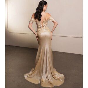 Reach new heights of elegance with the May Queen MQ2104 Dress, designed to captivate and shine. This stunning gown combines charm and sophistication with its draped sleeves and seductive off-shoulder design. Crafted from luxurious glitter fabric, it features a perfectly tailored corset bodice that highlights your natural grace. The mermaid silhouette adds a dramatic flair, making this dress the ultimate choice for an evening of glamour and unforgettable memories. Ideal for red carpet events, formal occasions, prom, or pageants, this gown is sure to make you the centre of attention.