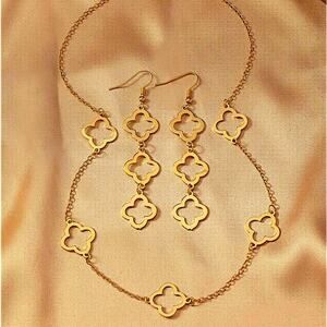 Gold Four Leaf Clover Necklace Earrings Set Luxury Dangle Two Piece Set