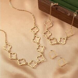Stainless steel gold four leaf clover matching necklace bracelet earrings set. Please message me size you want in necklace and bracelet.