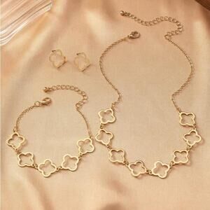 Gold Four Leaf Hollow Out Necklace Bracelet Matching Earrings Three Piece Set