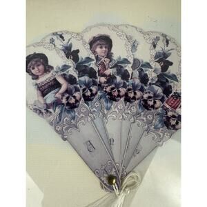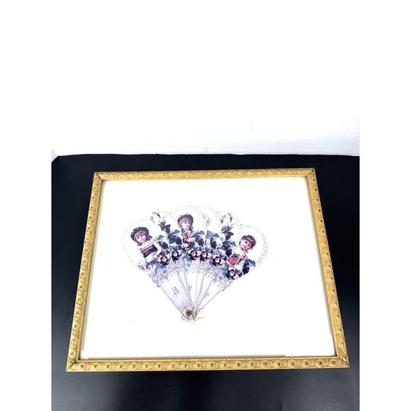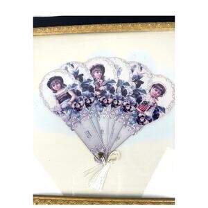 Gold Framed Victorian Girls Paper Fan Greeting Card by Old Print Factory Reprod.
