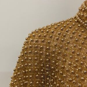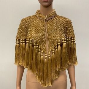 This exquisite shoulder accessory features a rich gold color with elegant fringe tassels that cascade beautifully. The structured upper portion complements the flowing fringe, creating a luxurious draping effect. Perfect for adding a touch of sophistication to any ensemble.