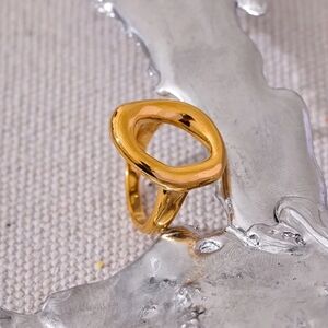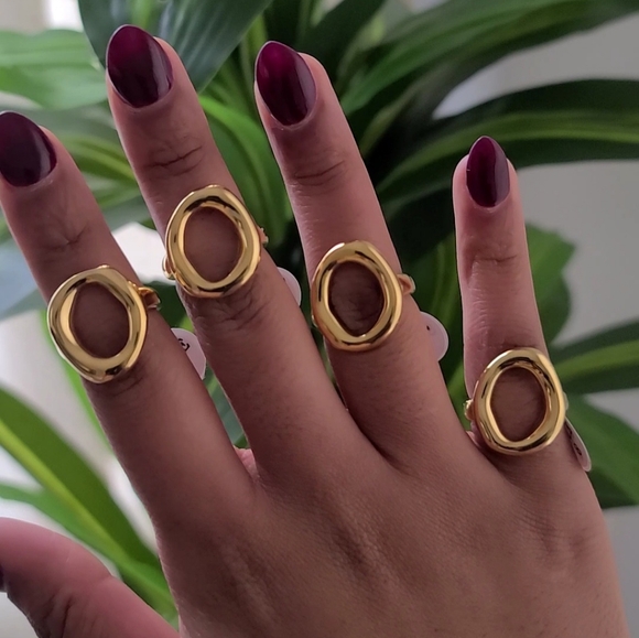 These gold rings feature a bold geometric design with a modern, minimalist aesthetic. Crafted with a shiny, polished finish, each ring showcases an open center that creates an intriguing negative space effect. Perfect for making a statement, these rings are both chunky and stylish.