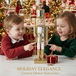 Celebrate the holiday season with this 14-inch North Pole wooden nutcracker featuring a traditional solider dressed in a glittering gold sequin jacket. Display it on a mantel or tabletop for a festive vibe.