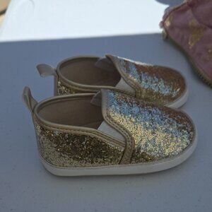 Sparkle with every step in these gold glitter slip-on shoes. Perfect for adding a touch of shine to any outfit.