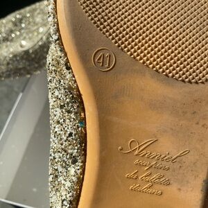 Sparkling gold glitter shoes with lace-up design. Perfect for adding a touch of glam.