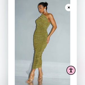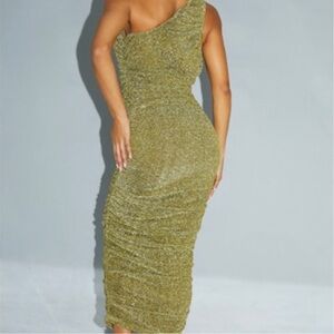 Gold Glitter Plisse Ruched One Shoulder Midi Dress size 16