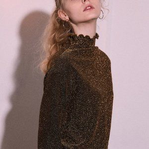 Drop shoulder; Comfortable fit; Inside soft material; Glitter material turtleneck; Neckline, Sleeve hem ruffle point
