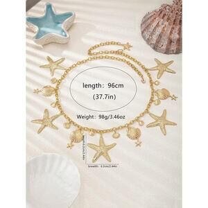 Add a touch of beachy elegance to your outfit with this stunning gold starfish and seashell waist chain belt! Perfect for adding a boho vibe to your summer look, this belt is sure to turn heads. The intricate design features delicate seashells and a beautiful golden starfish, creating a unique and eye-catching accessory.