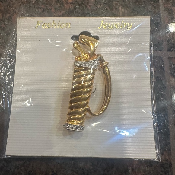 Elegant gold golf bag brooch with sparkling accents. Perfect for golf enthusiasts.