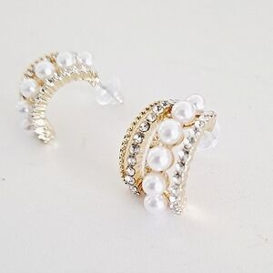 Gold Half Hoop Earrings Pearl Rhinestone Coquette Bridal Wedding Cocktail 💖