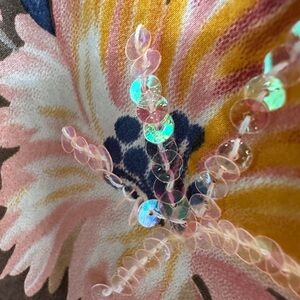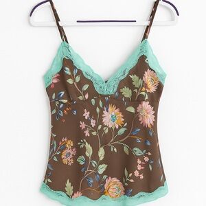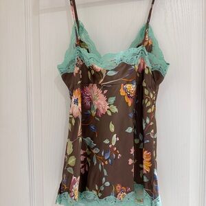 Elevate your wardrobe with this Gold Hawk silk camisole, brand new with tags. Crafted from 100% silk, this luxe brown cami features a vibrant floral print with hand-sewn bead and sequin embellishments for subtle sparkle. Aqua lace trim at the neckline and hem adds a delicate, romantic finish. Adjustable spaghetti straps ensure the perfect fit. A versatile piece that can be styled for day-to-night looks—wear it layered under a blazer, with denim, or as chic lingerie-inspired evening wear.
