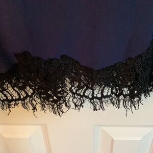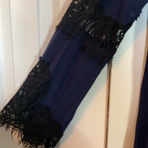 Another High Quality Gold Hawk piece from my closet. This is a navy shift dress with black lace embellishment in the sleeves and hem. Size M gently worn. Bell sleeves and includes slip.