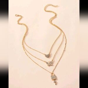 Gold Layered Necklace with Rhinestone Heart Buterfly Lock & Key Pendant