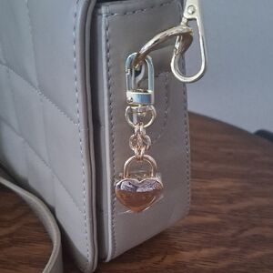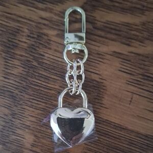 Gold heart charm. Perfect accessory for you purse, backpack, and key ring. Hangs 3". Gold is a shiny gold.