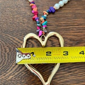 Elegant necklace featuring a gold heart pendant and vibrant multicolor beads. Perfect for adding a pop of color to any outfit.
