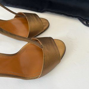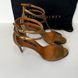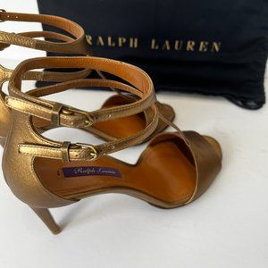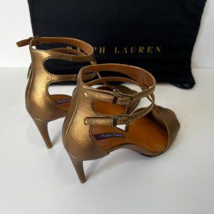 Gold color Ralph Lauren high heel sandal w/ twin strap and buckle closure at the ankle.