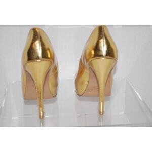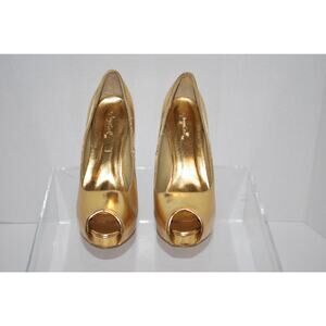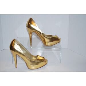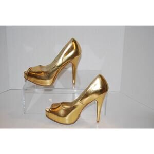 Shiny metallic gold tone synthetic material with a sexy little peep toe, stiletto heel measuring approx. 4.75" and a wrapped over wedge measuring 1" (approximate) at the highest place.