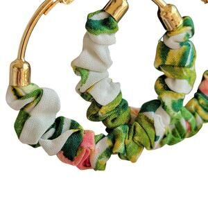 Gold Hoop Earrings Fabric Scrunch Detail 2.25" Green Pink With Gift Bag Trendy