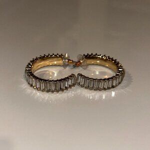 Elevate your look with these stunning gold-tone hoop earrings, featuring a full row of dazzling baguette-cut crystals. Their structured sparkle and elegant design make them the perfect statement piece for both everyday glam and special occasions. Lightweight with secure backings for comfortable wear.
