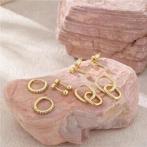 - Stylish gold-tone earring set with a mix of hoops and studs