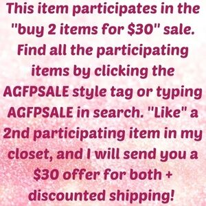 💖 BUNDLE THIS ITEM WITH ANOTHER 2/$30 ITEM IN MY CLOSET, AND I WILL SEND YOU A $30 OFFER ON BOTH! There are hundreds of participating items to choose from. To find these items, type AGFPSALE in the search bar on Poshmark or click the AGFPSALE style tag on this listing!