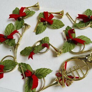 Gold Horn Napkin Rings Poinsettia Green Red Bells Christmas Holiday Party