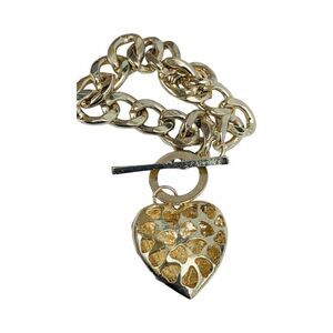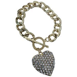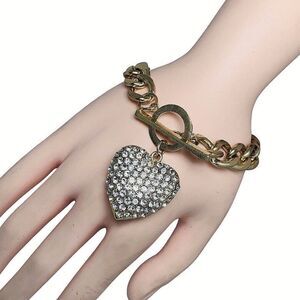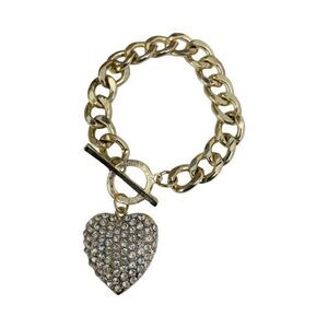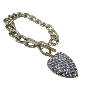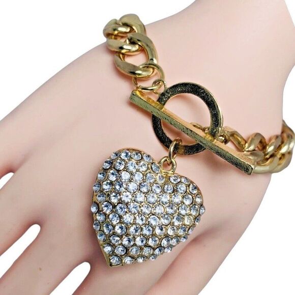 Gold Icy Crystal Heart Bracelet 8" Curb Chain Toggle Valentines Day Lovecore