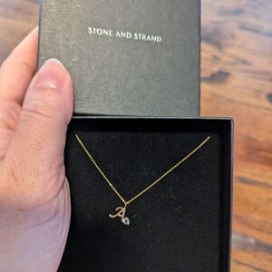 Elegant gold necklace featuring an 'A' initial and a sparkling blue topaz