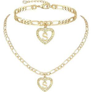 Gold Initial Pendant Necklace Anklet Bracelet for Women 14K Gold Plated Figaro