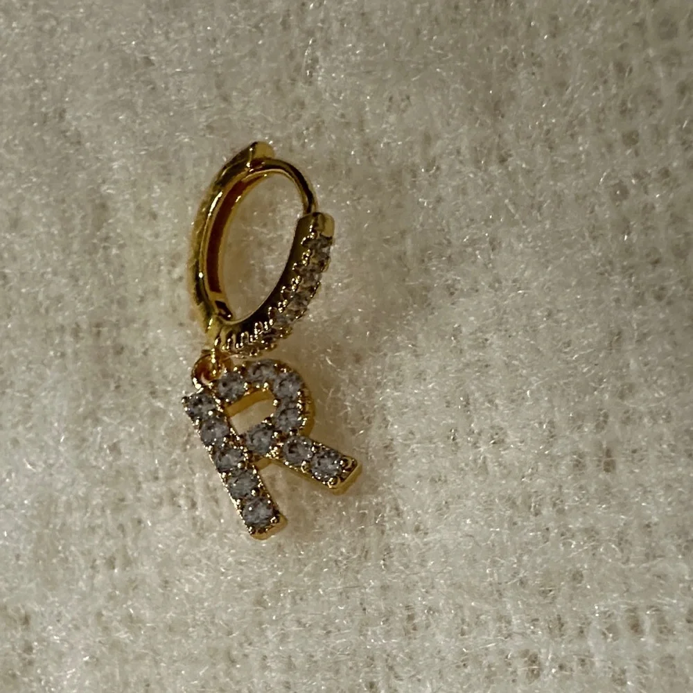 Elegant gold hoop earring featuring a sparkling 'R' initial charm. Perfect for adding a personalized touch to any outfit.